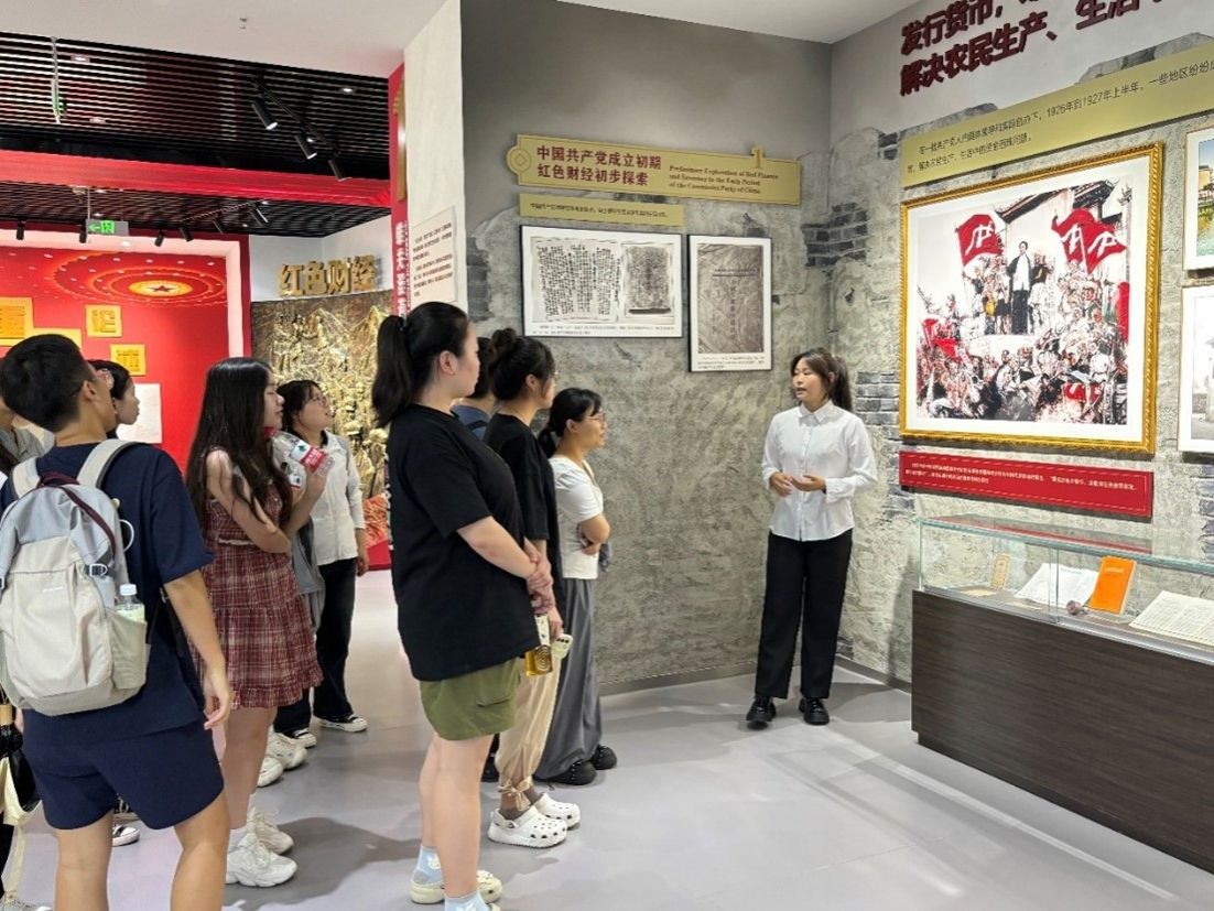 红色财经文化馆由财经救国、财经兴国、财经富国、财经强国四个展厅组成,用生动、真实的史料还原建党以来不同时期的财经人物及事迹,再现了波澜壮阔的红色财经史。师生们跟随讲解员,通过馆内的文字和图片及视频充分了解中国共产党领导下的财经发展历程,亲身感受共产党人信仰至上、矢志兴邦、艰苦奋斗、严于律己的精神。