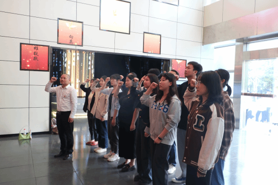全体师生整队肃立,沉默哀悼,用一朵朵鲜花寄托哀思,表达对革命烈士无私无畏革命精神的崇高敬意。在解说员的带领下,师生们重温了辛亥革命时期、新民主主义革命时期、社会主义革命和建设时期、改革开放和社会主义现代化建设新时期、中国特色社会主义新时代的烈士史料和感人事迹。在纪念馆内,学院党委副书记、纪委书记胡国平带领师生党员重温入党誓词,开展了主题党日活动。入党誓词回响百年,红色血脉赓续绵延,初心使命历久弥坚。铿锵有力的宣誓,彰显了全体党员顽强拼搏的奋斗决心,诠释了大家听党话、跟党走的坚定信念。