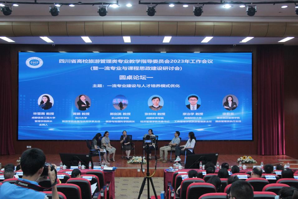 在下午的圆桌论坛上,来自四川大学、西南财经大学、西南民族大学、四川农业大学、成都信息工程大学、成都体育学院、成都理工大学、成都大学、乐山师范学院等18所院校的教指委委员和特邀专业带头人等,围绕“一流专业建设与人才培养模式优化”“课程思政高质量建设”“一流课程高质量建设”“一流团队与资源平台建设”四个议题展开了深入交流,为助推四川高校旅游管理类专业高质量发展献计献策。