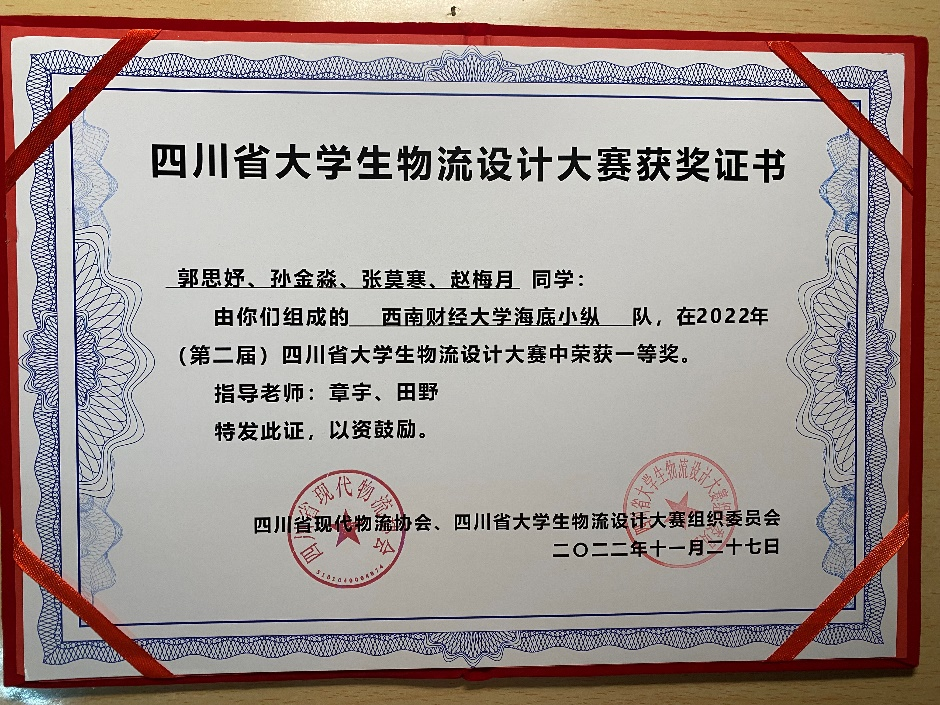 2022年11月26日,第二届四川省大学生物流设计大赛决赛在成都工业学院举行,本届大赛决赛阶段采用线上答辩的方式举行。西南财经大学工商管理学院供应链管理专业学生(郭思妤、孙金淼、张莫寒、赵梅月,指导教师:章宇、田野)在比赛中表现出色、载誉而归,荣获一等奖,章宇老师和田野老师获得优秀指导教师奖。本届大赛共有成渝地区25所高校419人参加,最终进入决赛角逐的共有36支代表队。大赛设一等奖、二等奖和三等奖和优秀指导教师奖。