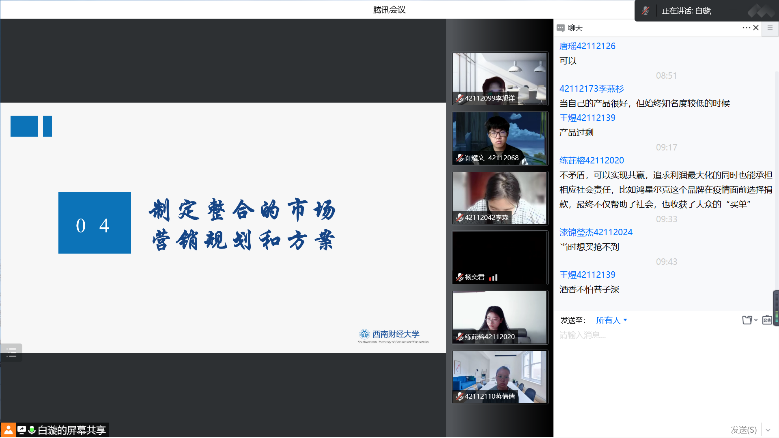 9月6日,作为西南财经大学开放的7门数字化课程资源之一,由工商管理学院市场营销系倾力打造,市场营销研究所所长白璇教授主讲的《市场营销学》课程在雨课堂和腾讯会议同步开讲,正式与西财学子以及来自中西部高校的近100名青年专任教师在云端如约相见。