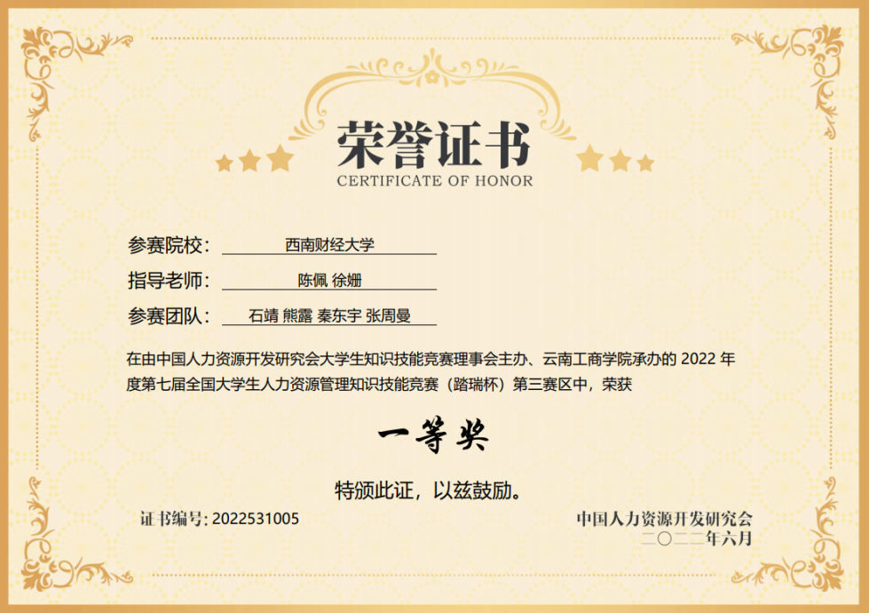 我院高度重视此次大赛,前期经过严格选拔,最终选定石靖(组长)、熊露、秦东宇、张周曼4位优秀的人力资源管理专业学生代表学校参加比赛。人力资源管理系系主任徐姗、副系主任陈佩亲自带队指导,参赛学生通过线上线下20余次的反复训练、讨论、分析,及时总结经验,不断提高团队的竞技水平,为后续比赛取得优异成绩打下了坚实基础。
