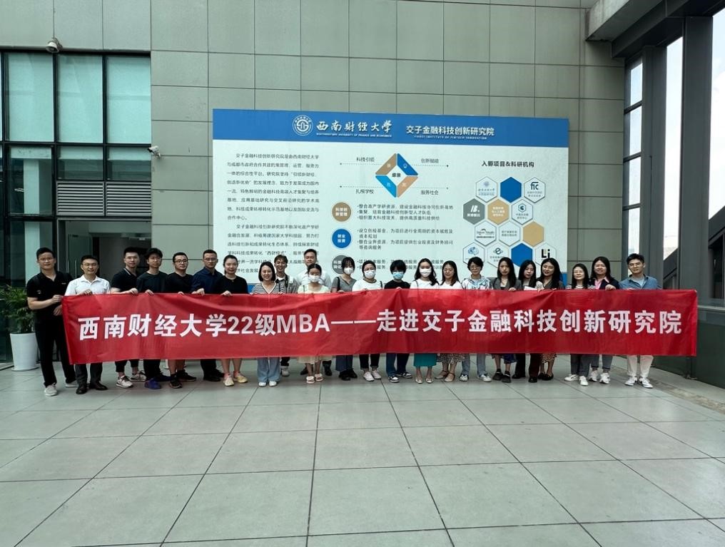 4月19日下午,为融入新经济时代发展浪潮,加强校企沟通交流,提升MBA学员实践思考能力,西南财经大学工商管理学院MBA教育中心与MBA联合会共同组织开展了“走进交子金融科技创新研究院”活动,中心教师李婧、蒋应涛带队,校友中心教师方谢萍,2020届MBA联合会主席团成员及2022级MBA研究生共二十余人参加。